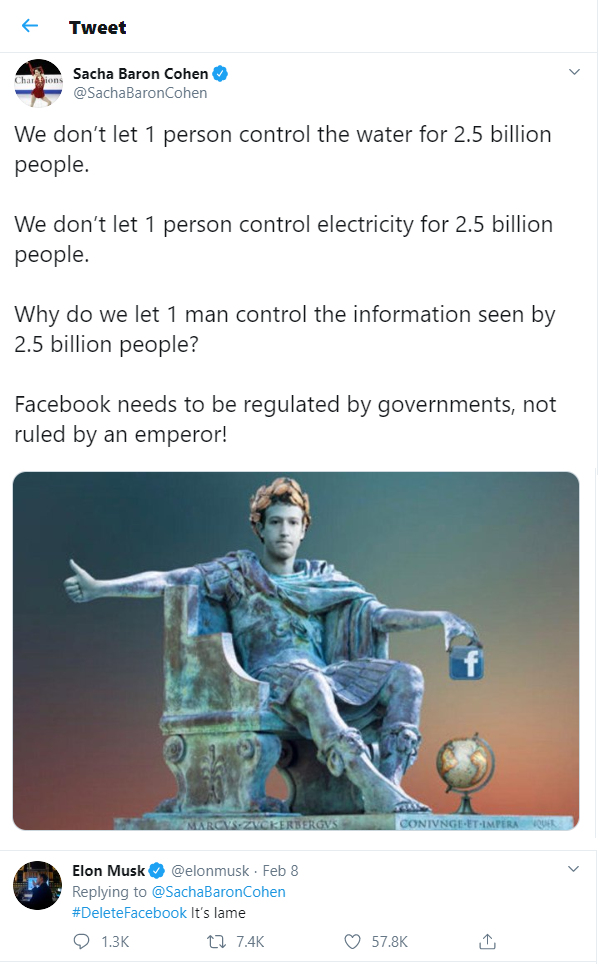 Reacting to a Twitter post by actor Sacha Baron Cohen calling for Facebook to be regulated by the government over its content, the Tesla founder tweeted “#DeleteFacebook It’s lame.”