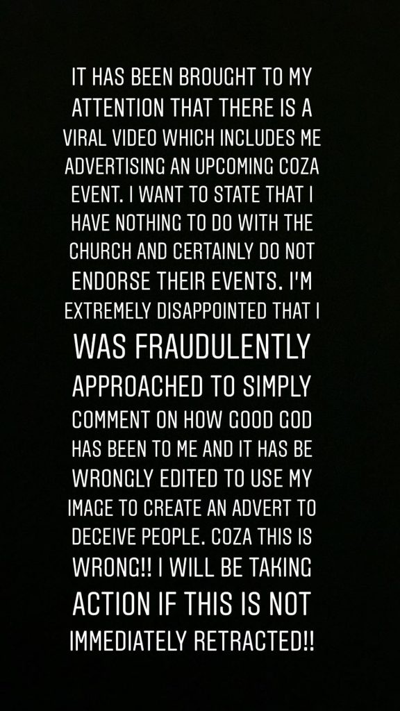 Tiwa vehemently warned the church to retract the video as she does not endorse the church or their event and she was fraudulently approached to simply state how God had been good to her this year.