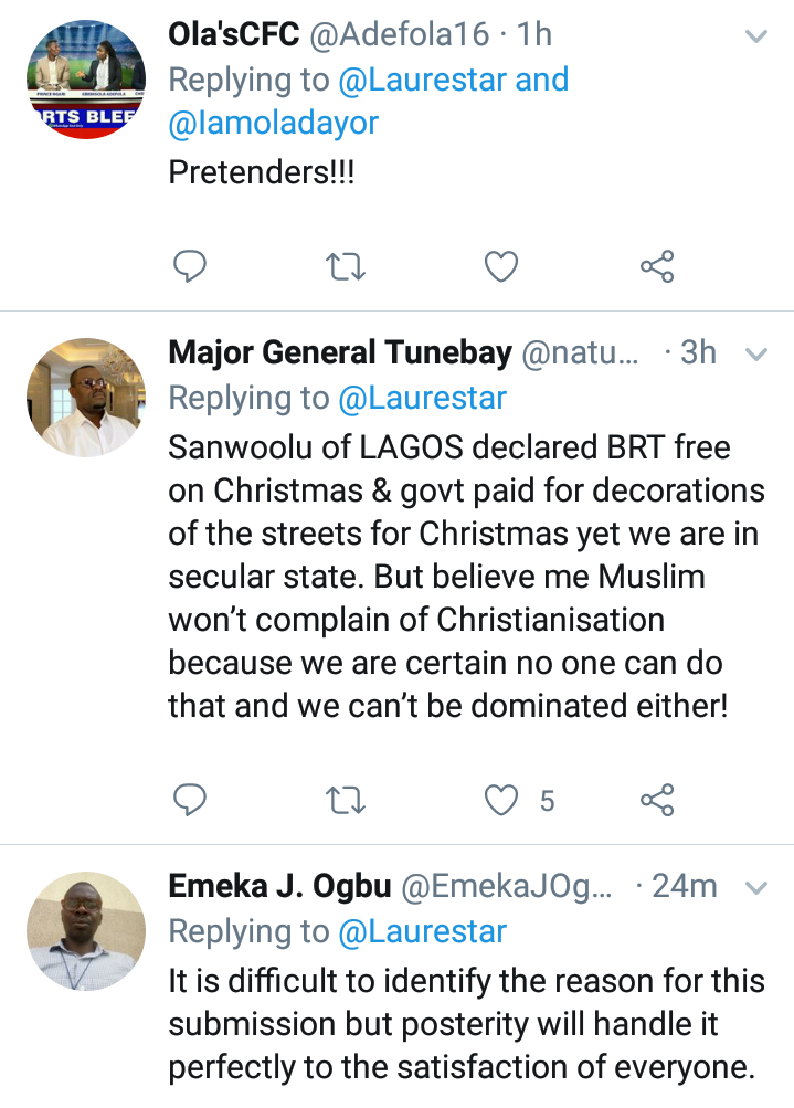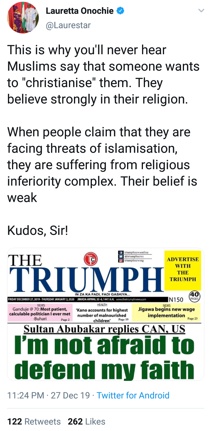 She gave her stand on the issue last night in a tweet while commending Sultan of Sokoto, Muhammad Abubakar, for his audacious response to the Christian Association of Nigeria (CAN) and the American Government on issues bothering the Islamic faith.
