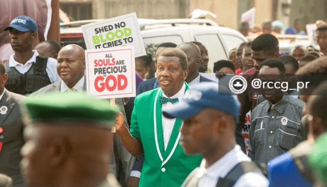 Adeboye on Sunday during the monthly Thanksgiving Service at the church’s National Headquarters in Ebute Meta, Lagos State, commenced the protest from Ebute Meta and is expected to lead it to Atan Cemetery in Yaba metropolis and back.