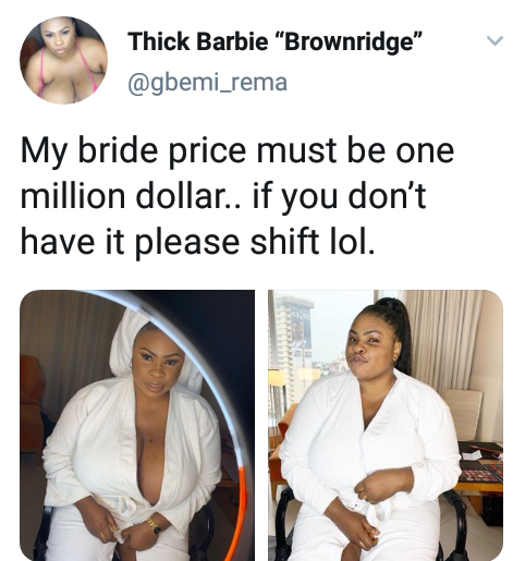 Entertainment Health newsMy Bride Price Must Be $1 Million, If You Dont Have it Shift Aside – Nigerian Lady Talks Tough on Social Media. by adminFebruary 24, 2020February 24, 20200704 Share0 Nigerian lady Gbemi a.k.a Thick Barbie Brownridge showed off her gigantic boobs on Twitter and declared that she will only accept one million dollar as bride price.