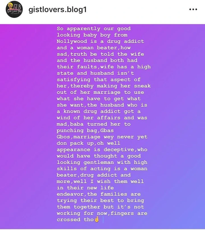 Popular controversial blogger known as Gistlovers, have been posting about the break up ever since it happened, but today, the blogger posted something that has stirred up a lot of Controversy on social media. She hinted that the actor is a drug addict and also a wife beater, and that the Estranged wife has a very high taste, and Gabriel was not meeting up to her standard, but the biggest controversial post the blogger made was the person all fingers are pointed at.