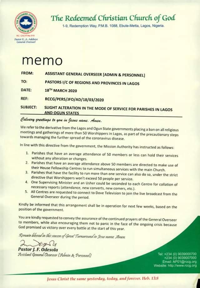 A memo titled: “Slight alteration in the mode of service for parishes in Lagos and Ogun states” from the Assistant General Overseer (Admin & Personnel) Pastor Johnson Folorunsho Odesola and addressed to pastors-in-charge of regions and provinces in Lagos dated March 18, 2020 outlined the changes.